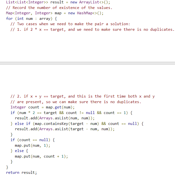 - A = {2, 1, 3, 2, 4, 3, 4, 2}, target = 6, return [[2, 4], [3, 3]]